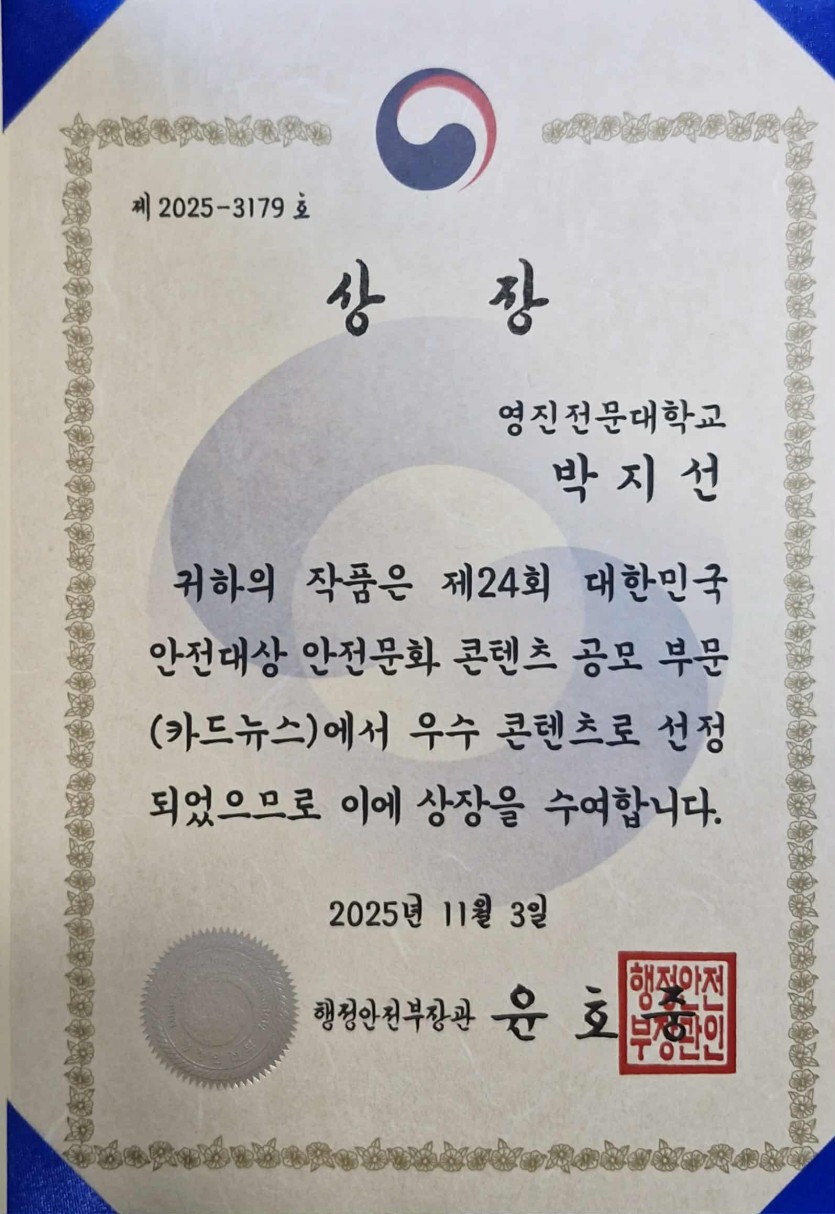 [공모전 수상] 제24회 대한민국 안전대상 콘텐츠 공모전 <행정안전부 장관상> !! 손교수 0 154 09.23 16:29 <제24회 대한민국 안전대상 콘텐츠 공모전>에서 온라인콘텐츠마케팅반 2학년 박지선 학생이 <행정안전부 장관상>을 수상했습니다.