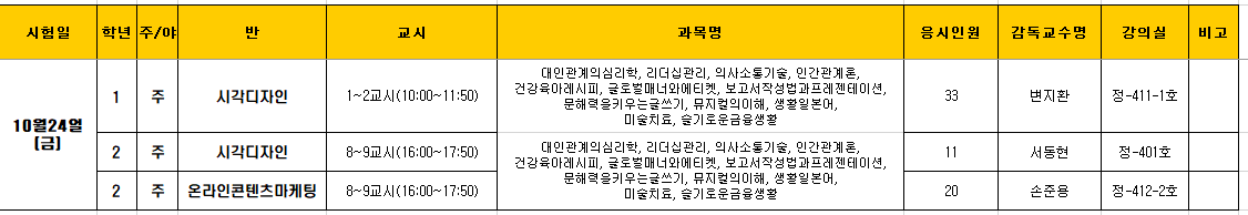 25학년도 2학기 교양 중간고사 실시 안내 백조교 0 58 10.20 11:40 25-1학기 교양 시험 일정일 안내드립니다.온라인 시험 안내-토익, 미래교육을위한구글활용을 수강한 학생은 10/20 ~ 10/24 YBM 사이트에서 온라인 시험을 진행합니다.-토익스피킹은 10/13~10/20 YBM 응시그 외 교양 과목은 아래 표를 참고해주시기 바랍니다.