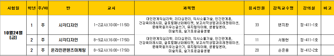 25학년도 2학기 교양 중간고사 실시 안내 백조교 0 3 6시간전 25-1학기 교양 시험 일정일 안내드립니다.온라인 시험 안내-토익, 미래교육을위한구글활용을 수강한 학생은 10/20 ~ 10/24 YBM 사이트에서 온라인 시험을 진행합니다.-토익스피킹은 10/13~10/20 YBM 응시그 외 교양 과목은 아래 표를 참고해주시기 바랍니다.